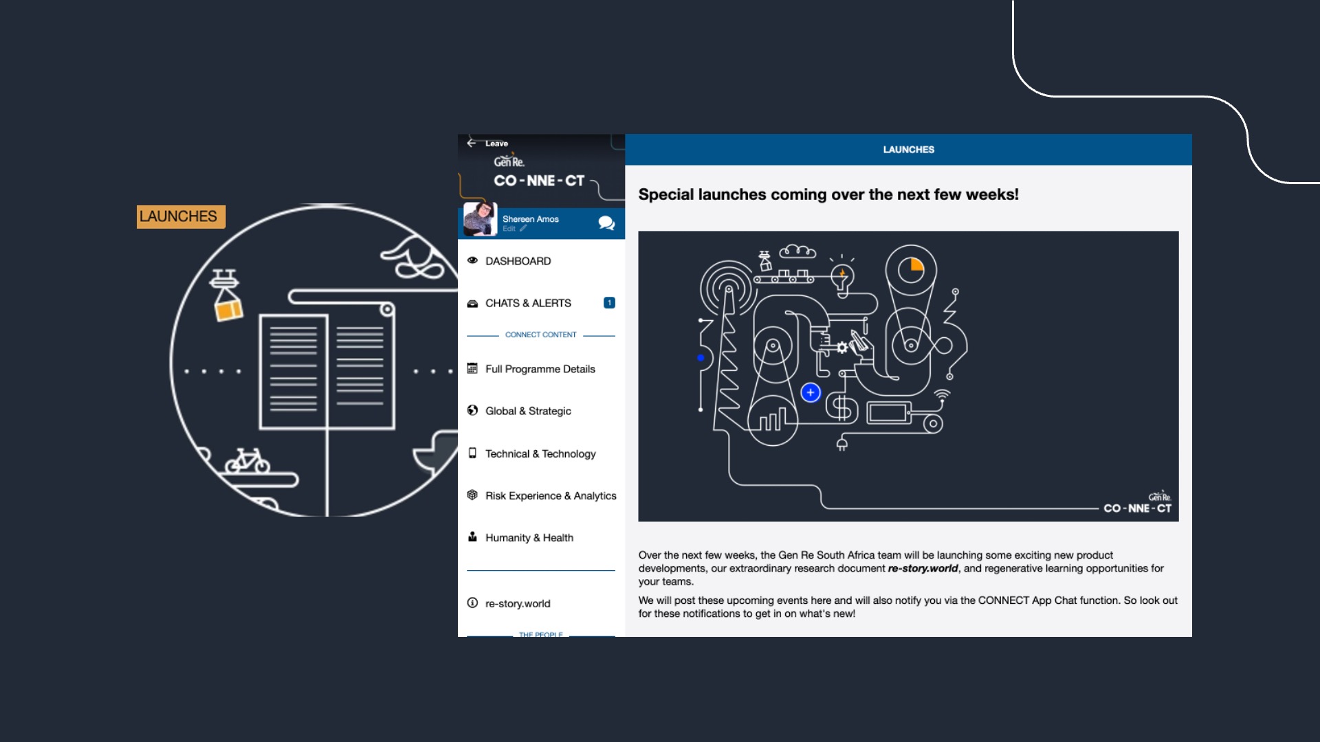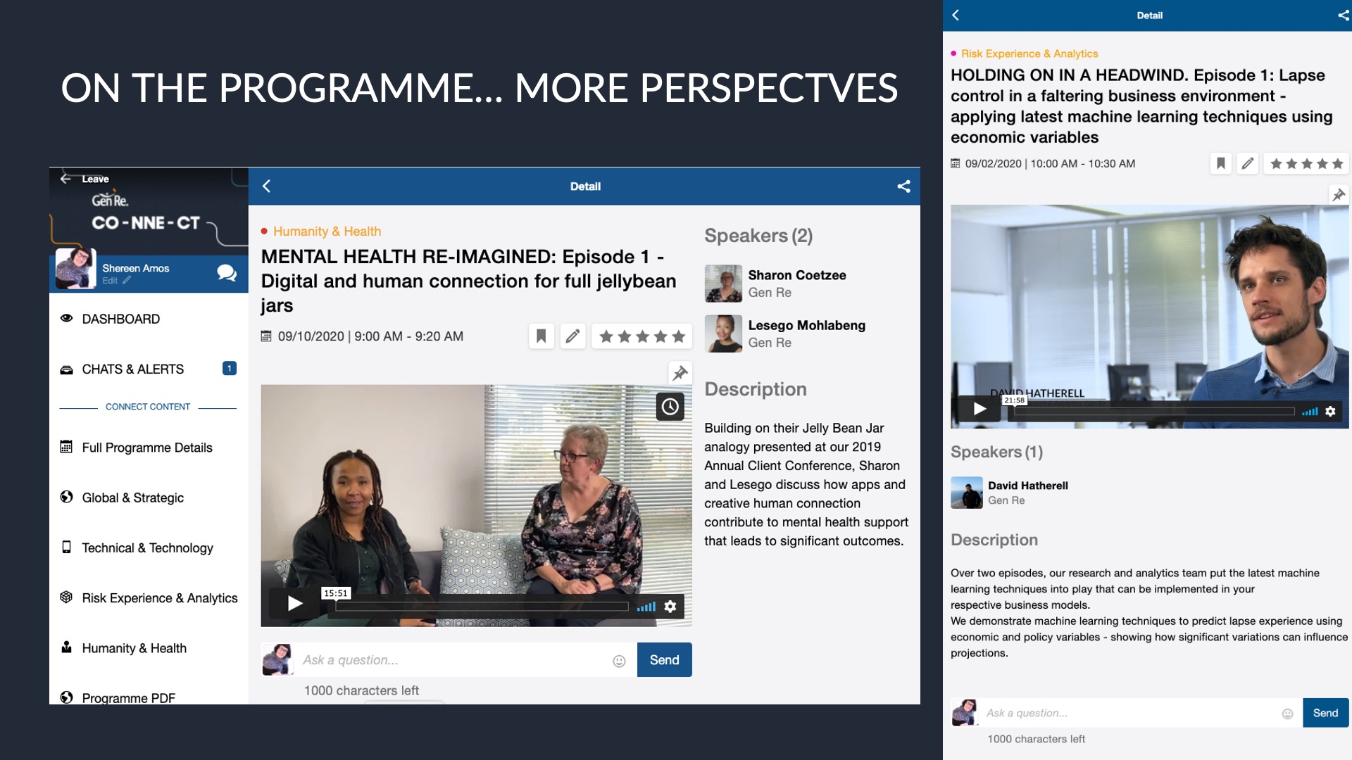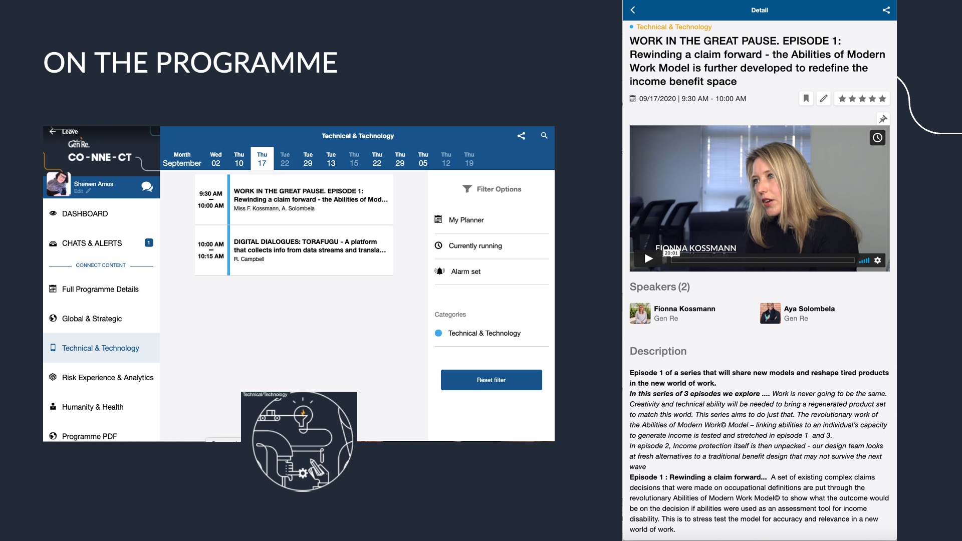For Gen Re, traditional client conferencing was no longer an option, so we quickly adapted by launching an online event platform to host live and recorded talks, presentations, papers, and reports—all in one place. We branded it CO-NNE-CT, a theme we had, serendipitously, chosen in 2019.