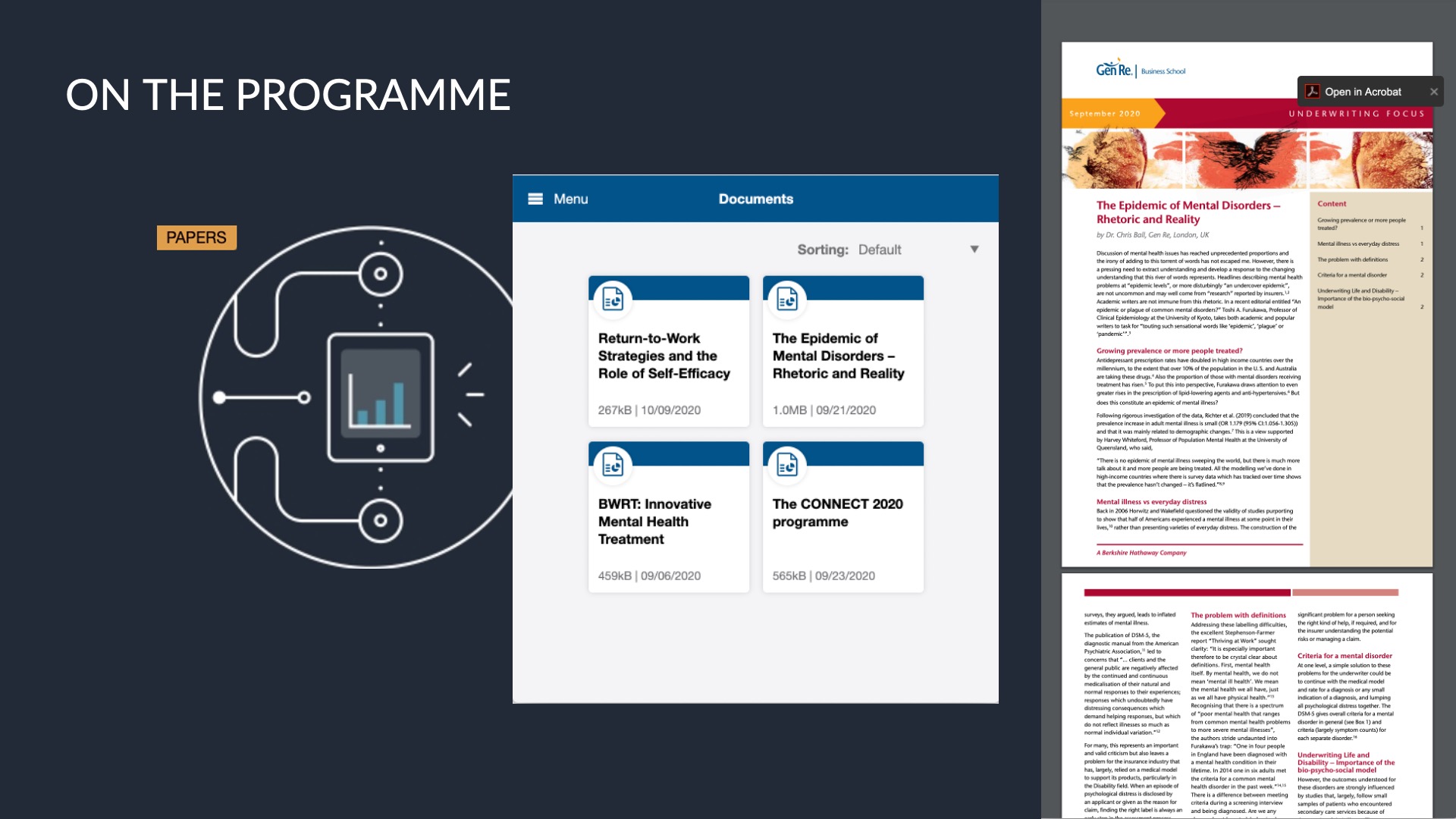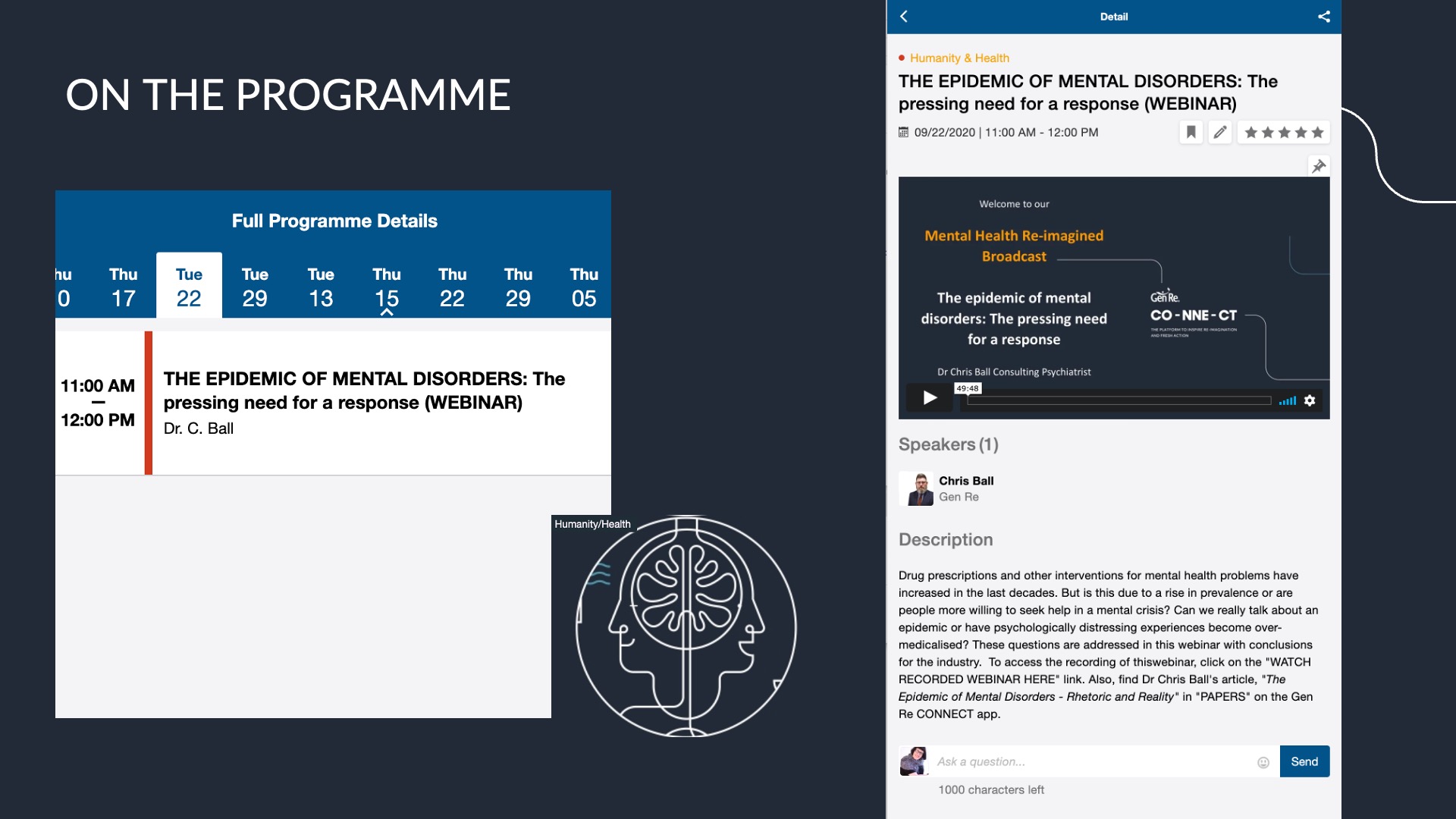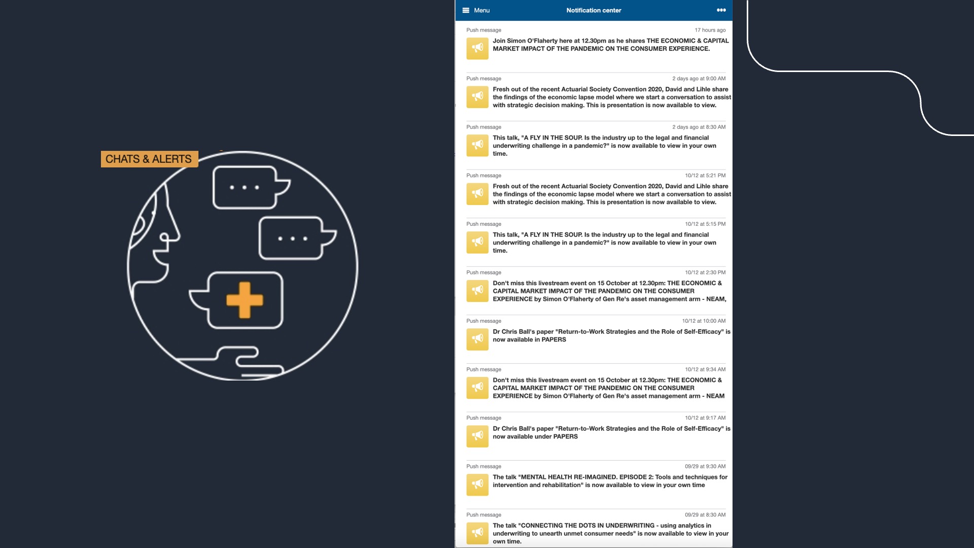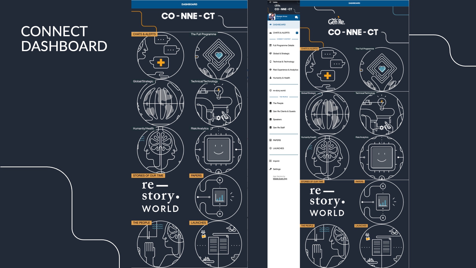 For Gen Re, traditional client conferencing was no longer an option, so we quickly adapted by launching an online event platform to host live and recorded talks, presentations, papers, and reports—all in one place. We branded it CO-NNE-CT, a theme we had, serendipitously, chosen in 2019.